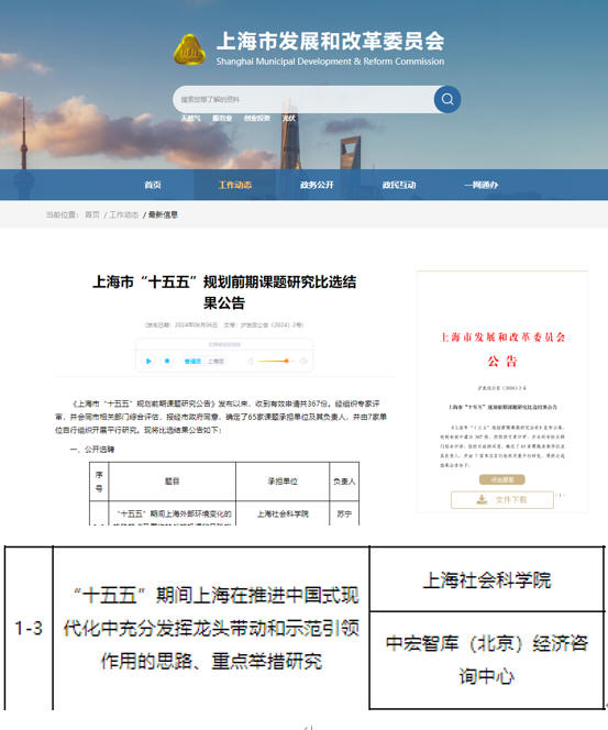 近日,中宏智库参与了上海市发展和改革委员会组织的《上海市“十五五”规划前期课题研究》申报工作。在与众多研究机构的比选中胜出,成功中标《“十五五”期间上海在推进中国式现代化中充分发挥龙头带动和示范引领作用的思路、重点举措研究》项目。
